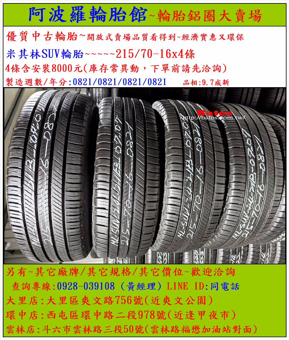 商品說明: 優質二手輪胎4條含安裝$8000元